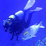 a napoleonfish who must have weighed in at well over 100 kg swimming in water less than two metres deep.